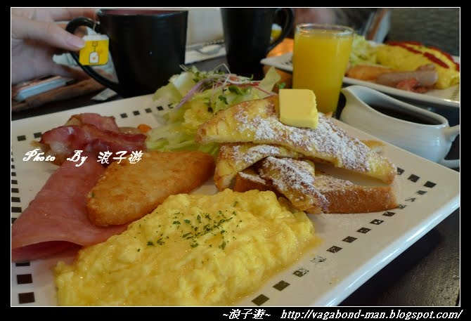 附德式香腸火腿薯餅、法式蛋汁 吐司、生菜沙拉、 蛋兩顆:做法嫩炒蛋、太陽蛋兩面煎法任選一種,飲料有: 柳橙汁、紅茶、熱咖啡。